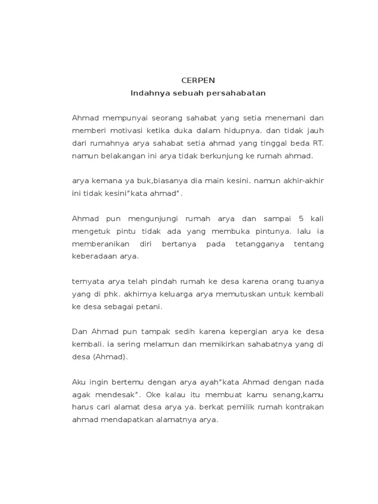Cerpen Persahabatan Sejati. Mengutip buku Kumpulan Cerpen Karya Anak Bangsa oleh Afwan Sutdrajat berikut salah satu contoh cerpen tentang persahabatan. Bertebaran dari sebuah surau di dekat parit dengan seorang pengajar yang sudah cukup umur di sinilah mereka mendapatkan ilmu agama.