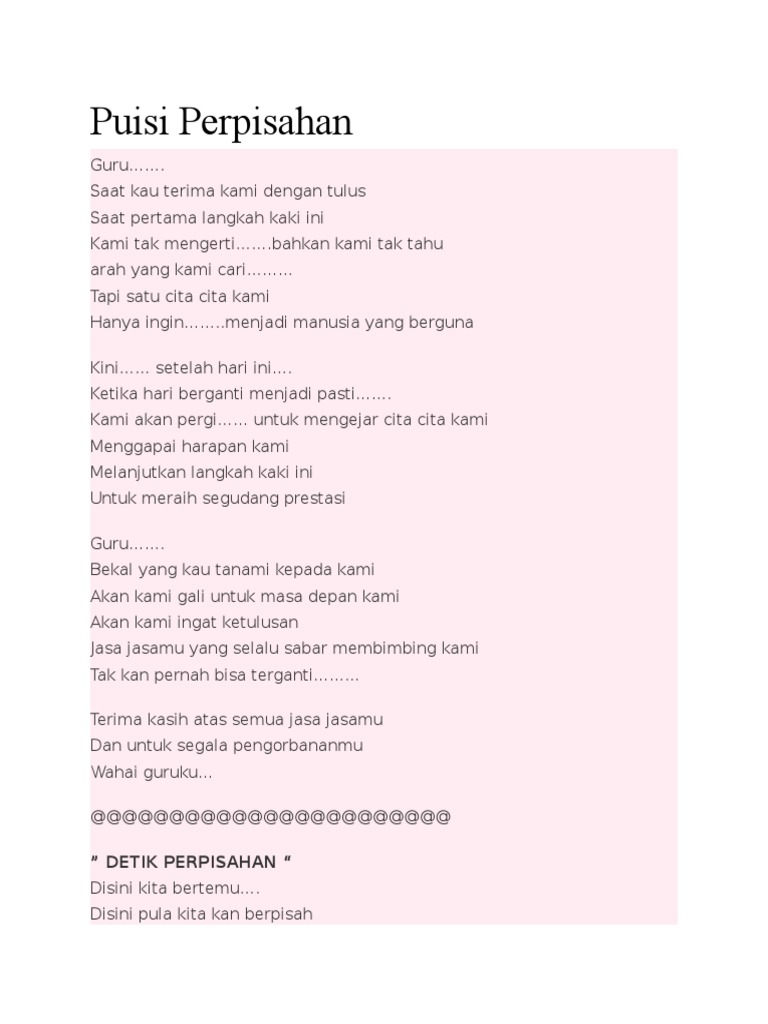 Dalam membuat puisi cinta kita harus mengeluarkan semua perasaan yang sedang kita alami saat ini. Puisi Perpisahan Dari Adik Kelas Untuk Kakak Kelas 30 Puisi Perpisahan Sahabat Guru Orang Tua Yang Paling Berkesan Teks Pembawa Acara Ii Docx Document 15 Puisi Perpisahan Sekolah Guru Tercinta Dan Sahabat Mengharukan Smpkpugung Selamat Jalan Kakak Top 10 Pollo Graph Puisi Bahasa Inggris Tentang Perpisahan Kakak. Puisi perpisahan kelas IX SMPN.